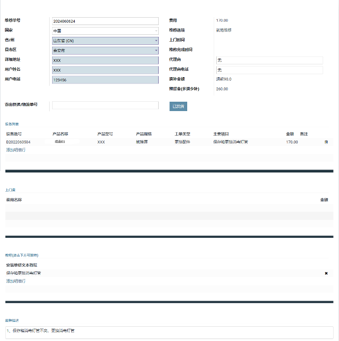 工程师在完成工单后上传必要的图片、文字等信息,例如用户正门照、设备正面照片、设备铭牌照片、配件退换照片、完工凭证照片、售后反馈表等图片,并标明上门时间以及维修完成的时间,若上传有误或者第三方邮寄的配件不符合故障原因,则视为此维修单未完成。